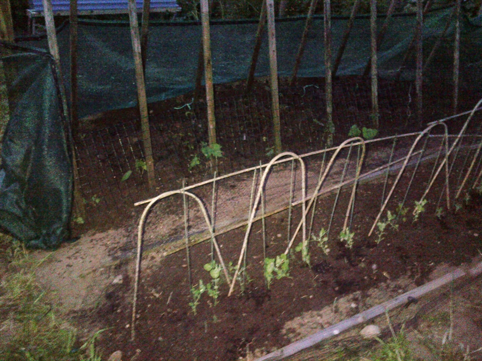 | Row of peas, netted up and watered. |